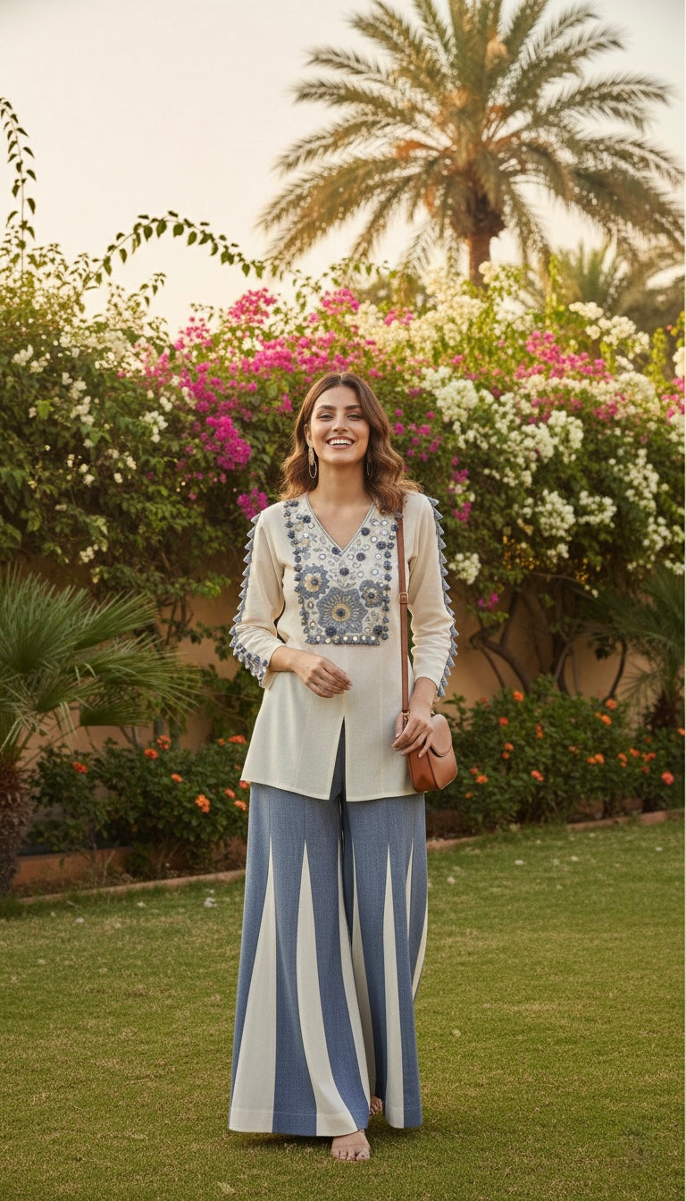Paired with a flowy, high-waisted palazzo designed with vertical blue panels, this set enhances height and movement while maintaining effortless comfort. Whether styled for brunches, festive gatherings, or elevated everyday wear, this ensemble delivers a polished Indo-western look with premium appeal.